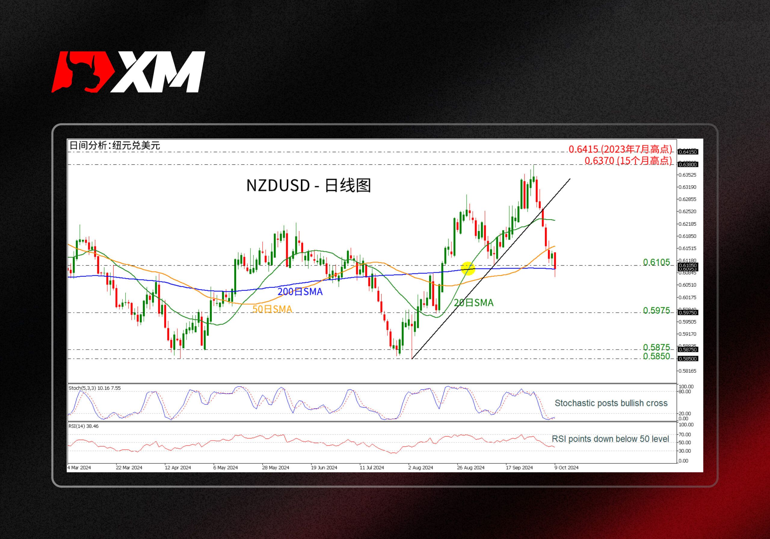 新西兰联储决定降息50个基点后,NZDUSD大幅下跌 。目前汇价接近0.6100关口 ,在200日移动平均线(SMA)附近获强劲支撑后持稳。