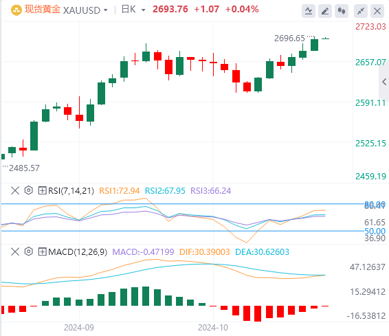 周五亚盘 ,黄金交投于2693.74附近。金价周四在创下历史新高,但由于美国大选的不确定性,金价未能触及2700美元。数据方面 ,在零售销售和就业数据公布后 ,美国经济仍然具有弹性,尽管它并未打压贵金属 。美国商务部透露,零售额增长略高于预期。与此美国劳工部公布了首次申请失业救济人数减少的数据 ,这打压了金价。   技术面:黄金的上行偏见完好无损 。多头可能会在短期内将黄金现货价格推高至2700美元的心理水平 ,因为相对强弱指数(RSI)表明买家正在蓄势待发。黄金的第一个阻力位是年初至今的高点2696美元。一旦清除,将移动到2700美元,然后是2750美元和2800美元 。相反 ,如果黄金跌破10月4日的高点2670美元,则有望回撤至2650美元。如果进一步走软,下一个支撑位将是2600美元 ,然后是50天简单移动平均线(SMA)2561美元。