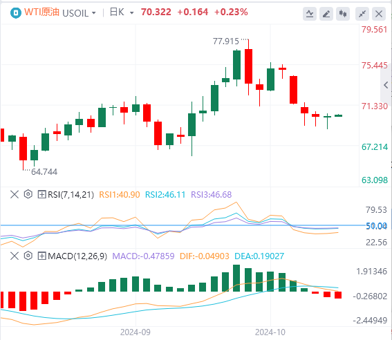 周五亚盘,原油交投70.32附近 。周四公布的政府数据显示,美国原油库存减少了219万桶。这一降幅高于行业组织的预测 ,而彭博社用户预测的增幅为130万桶。这份报告发布之际 ,由于有报道称以色列将避免袭击伊朗的原油设施,油价长期低迷 。不过,冲突仍没有减弱的迹象 ,以色列称哈马斯领导人叶海亚·辛瓦尔已被以色列国防军击毙 。以色列还加强了对黎巴嫩的空袭,美国隐形轰炸机袭击了也门与伊朗支持的胡塞叛军有关的武器储存地点。   技术面:如果WTI原油收于71.00美元以上,它将朝着最近的阻力位前进,即位于72.00美元–72.50美元区间。