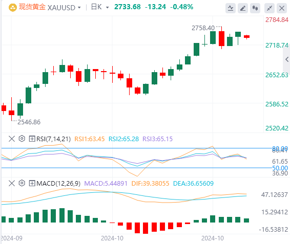 周一亚盘 ,黄金交投于2733.68附近 。周一亚洲早盘时段 ,黄金价格走低至2735美元附近,结束了两连跌。不过,在地缘政治局势持续紧张和美国总统大选存在不确定性的情况下 ,金价下行空间可能有限。   技术面:金价首个支撑可能在2700美元 。若跌破这一支撑,金价可能在2675美元(20日简单移动平均线)和2635美元受到支撑。在下行方面 ,如果金价跌破10月23日低点2708美元,下一个支撑位将位于38.2%斐波那契回撤位2699美元,随后分别是50%和61.8%的斐波那契回撤位2681美元和2662美元。