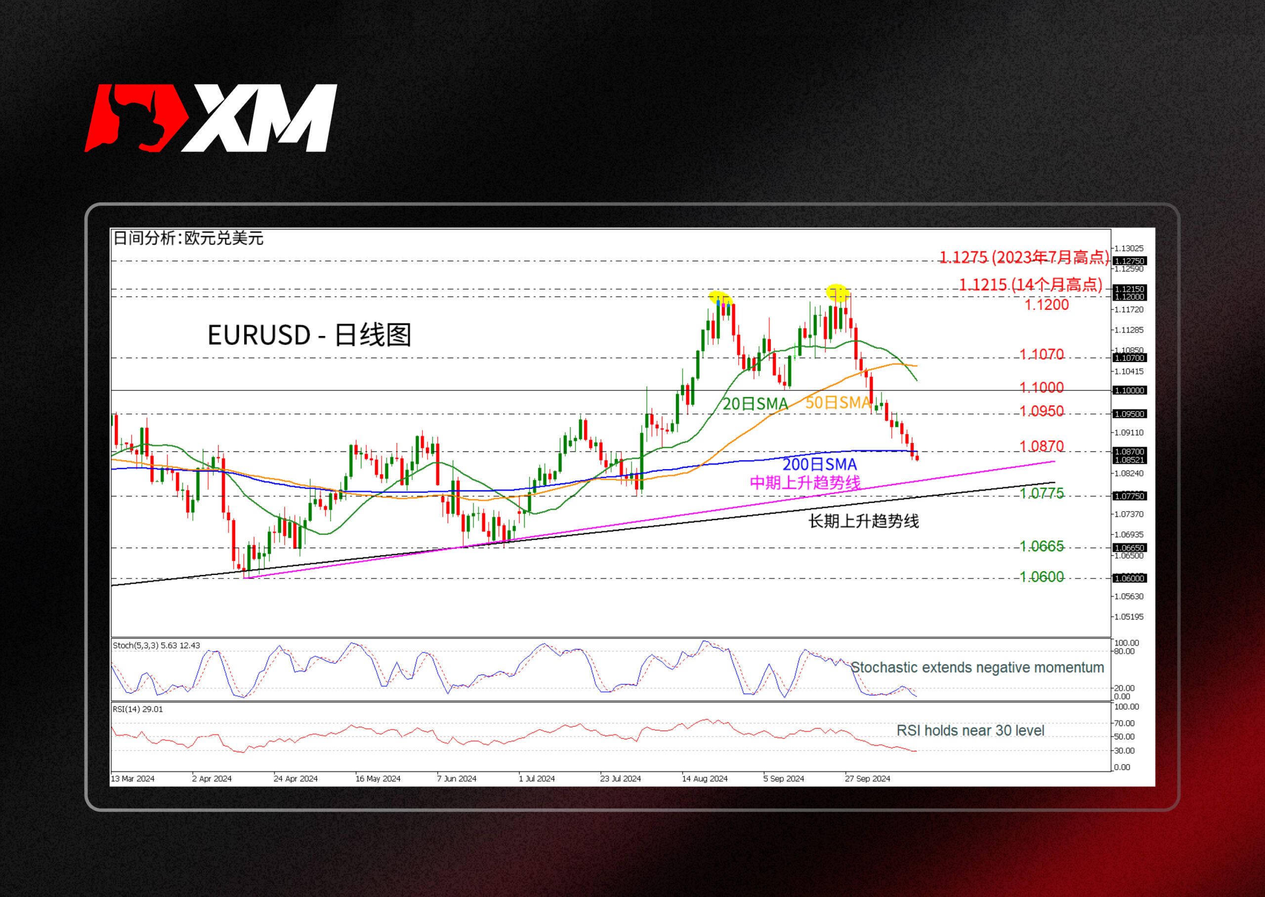 XM官网欧洲央行公布利率决策前数小时,EURUSD持续下跌,汇价已跌破200日移动平均线(SMA)和前期高点1.0870 。